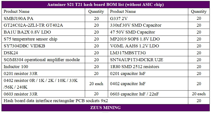 Lista de componentes del tablero de hash Antminer S21 T21 sin chips ASIC: